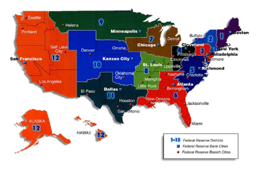 The Federal Reserve sprawls across thirteen cities with power deliberately fragmented between Washington and twelve regional banks—Boston, New York, Philadelphia, Cleveland, Richmond, Atlanta, Chicago, St. Louis, Minneapolis, Kansas City, Dallas, San Francisco.
